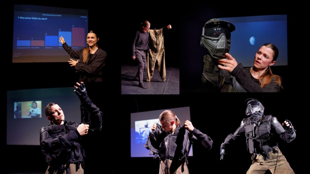 Die „Bochumer Sicherheitskonferenz“ verhandelt diese Fragen in einem interaktiven Theaterstück. Die ‚Moderatorin‘ schaltet zunächst bekannte Politiker:innen dazu, die ihre Einschätzung der Lage geben sollen. Und auch die Schülerinnen und Schüler sind eingeladen, ihre Wahrnehmung zu teilen. Mittels digitaler Umfrage erfassen wir ihr Stimmungsbild zu den brennenden Fragen der Sicherheit: Wie sicher fühlen Sie sich in Zeiten von Aufrüstung, Propaganda und gesellschaftlichen Gräben? Ist Pazifismus zur Romantik verkommen? Wie weit würden Sie für Wehrhaftigkeit gehen, wenn wir uns doch nach Frieden sehnen? Die Stimmen aus Publikum und Politik gehen jedoch nicht spurlos an der Moderatorin vorbei. Krieg beginnt in den Köpfen, sagt ein Gast, und in die Köpfe kommt er durch die Bildschirme. Während die Moderatorin versucht, auf die Eindrücke zu reagieren, verwandelt sie sich zunehmend. Wann ist der Moment, dass wir nicht mehr über Gewalt reden, sondern sie anwenden?